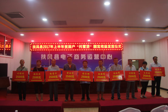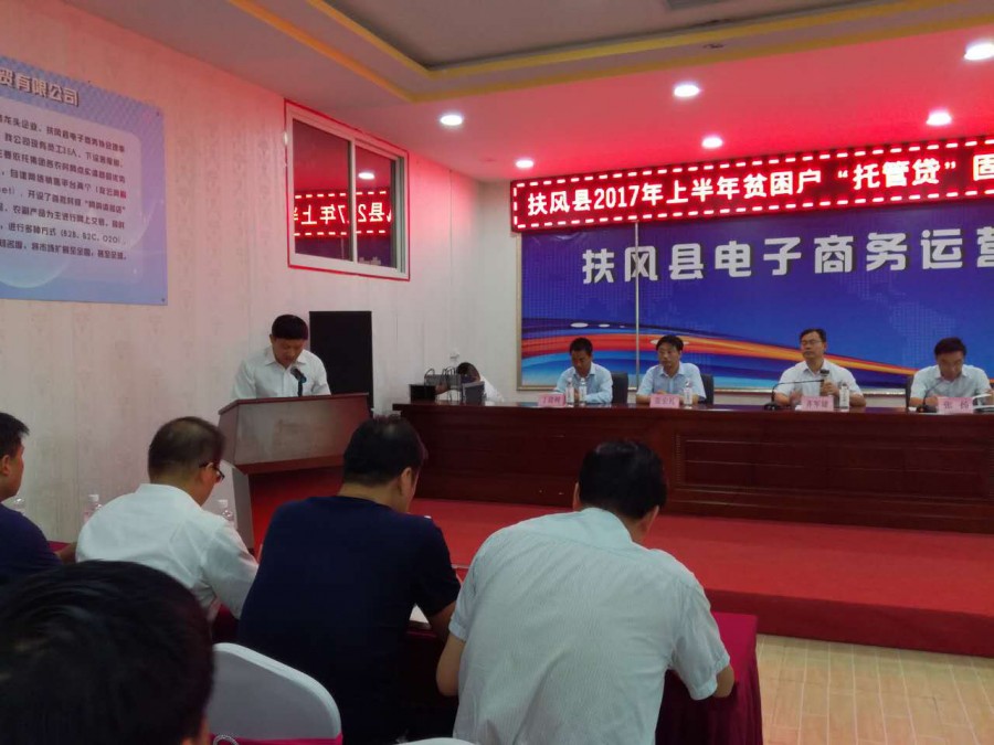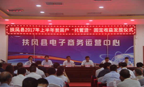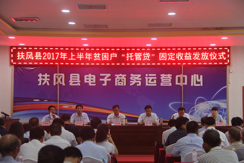 扶风县2017年上半年贫困户“托管贷”固定收益发放仪式7月5日下午在陕西新贸集团友云电子公司会议室隆重举行。县长齐军建、县委副书记张扬、县人大副主任张宏礼、副县长曹宏涛、丁建树、县政协副主席李文晖出席会议,各镇街、政府办、财政、商信、扶贫办、人行、农发行、信用联社、农业银行、邮储银行主要负责人及业务主管,“托管贷”龙头企业陕西新贸集团、32个农民专业合作社、20名贫困户代表共150余人参加会议。