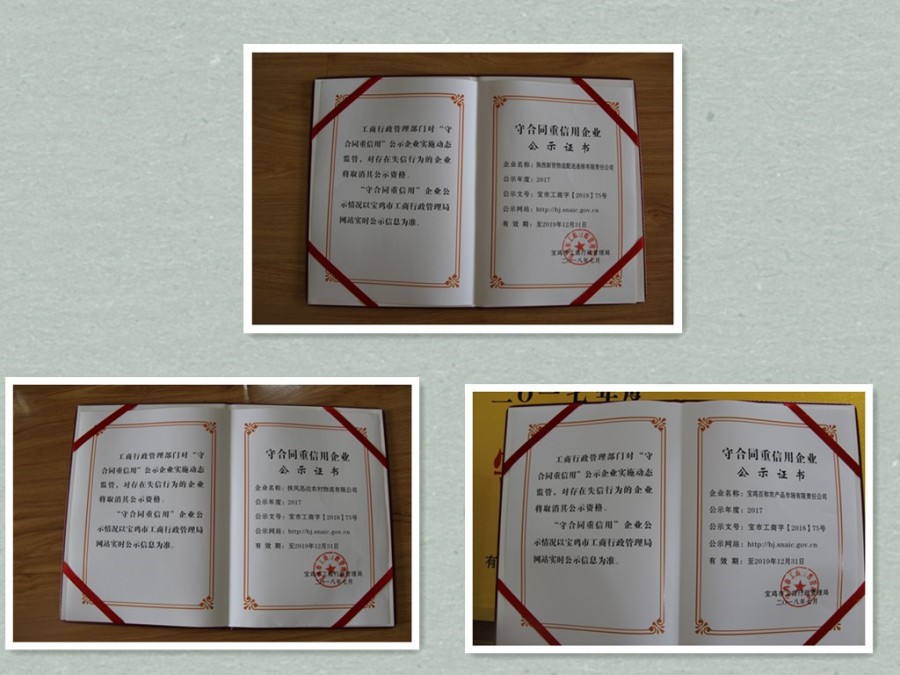 8月14日,集团公司门前迎风逸彩、喜气洋洋,在市县工商和市场监管部门的亲切指导下,新贸集团旗下扶风迅达农村物流有限公司、宝鸡百和农产品市场有限责任公司、陕西新贸物流配送连锁有限责任公司3户企业被授予市级“守合同重信用”企业。