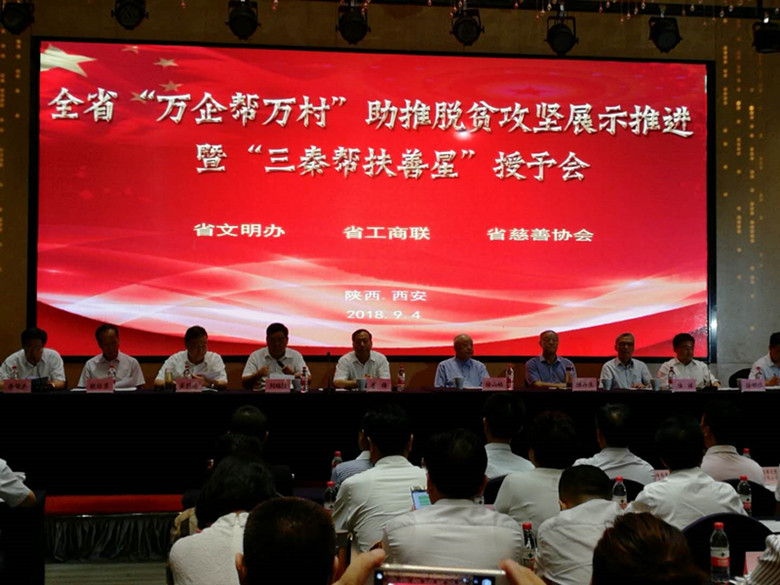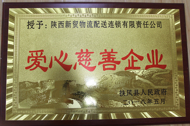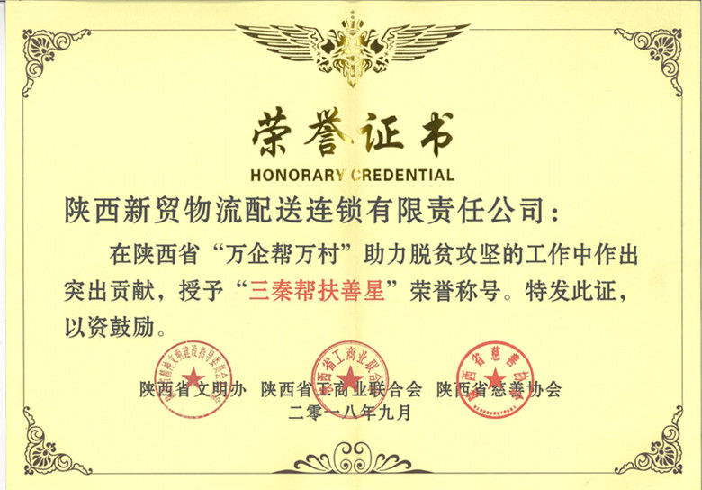 2018年9月4日,陕西省文明办、陕西省工商业联合会、陕西省慈善协会联合对在“万企帮万村”助推脱贫攻坚工作中做出突出贡献的民营企业予以表彰,陕西新贸物流配送连锁有限责任公司在全省参与活动的5418家企业中脱颖而出,被授予“三秦帮扶善星”荣誉称号。
