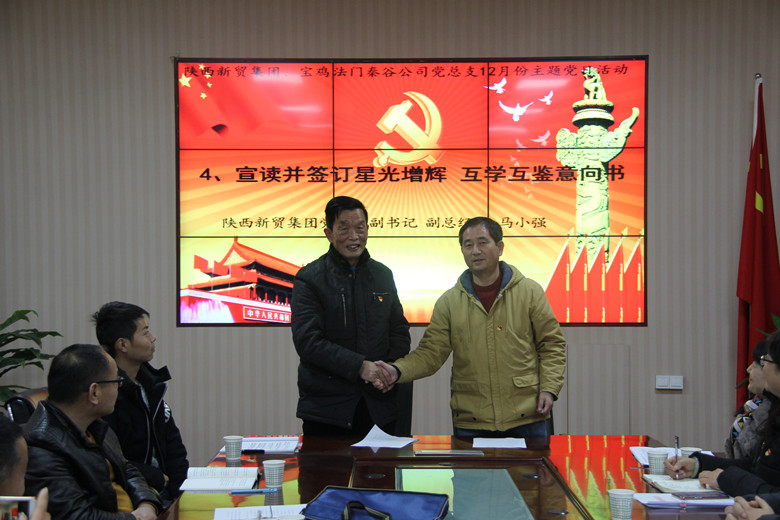2018年12月7日下午,由县非公党委组织,陕西新贸集团、宝鸡法门秦谷食品有限公司党组织在新贸集团机关党员活动室召开题为“星光争辉 签订互学互鉴意向书”的主题党日活动。