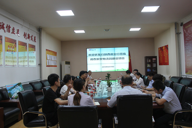在机关会议室,李林森董事长向调研组一行专题汇报了省级重点建设项目陕西新贸现代物流园建设进度情况:总投资3.5亿元,占地212亩,总建筑面积141333㎡。一期总投资2.02亿元,现已完成征地114亩,建成气调冷藏库、仓储物流示范库、农产品交易大厅、电子商务大楼及其它配套附属工程76874㎡,计划于今年底投入运营。自去年6月份以来,该项目受到国家有关部委、省市县各级政府部门、金融单位的高度关注。交通运输部总工程师周伟、运输服务司司长徐亚华、部经发部主任吴天生、部科学研究院管理处长李忠奎等司局领导先后四次莅临调研;中国农业发展银行创新部农地处长张维、省农发行副行长张国华、创新处长赵明、粮棉油处长任芝荣也曾先后四次来集团考察调研。今天李社辉处长、陈娜处长再次亲临项目建设现场调查,感谢农发行的关注和支持。