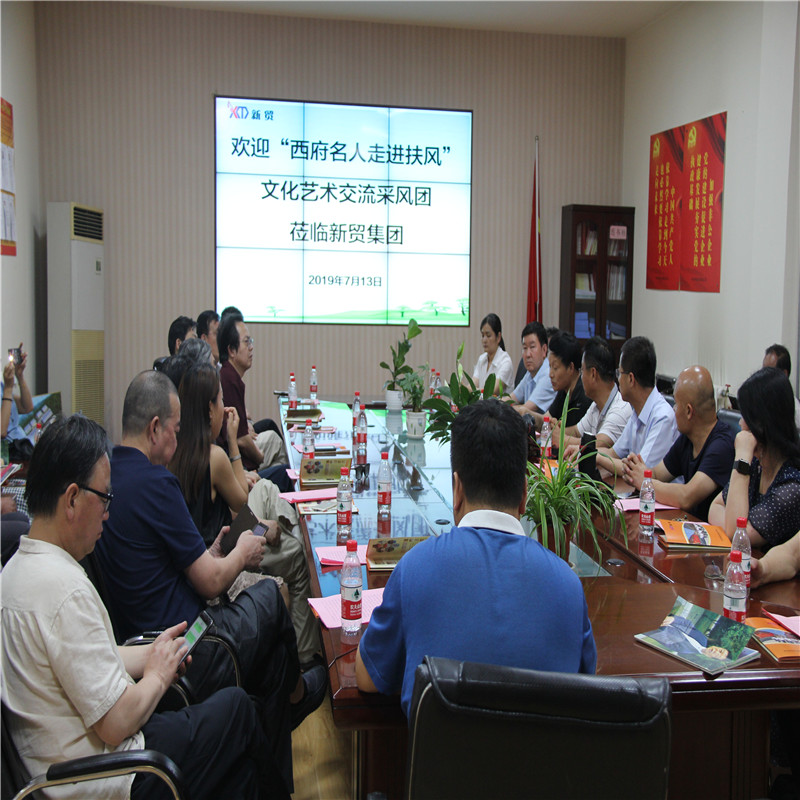 在机关二楼会议室,各位嘉宾和公司领导进行了简短的座谈会。董事长李林森对各位嘉宾的到来表示热烈的欢迎,就新贸集团的发展历程及现有主营业务做了介绍,并就公司的党建以及各项工作取得的成绩进行了汇报。董事长李林森表示,民营企业的发展离不开各级各部门的大力支持,更需要社会各界尤其是文艺届的各位名家的持续关注,希望各位嘉宾能在各自的领域内为新贸集团多做宣传,结合自身所长对新贸集团的发展提出宝贵建议。