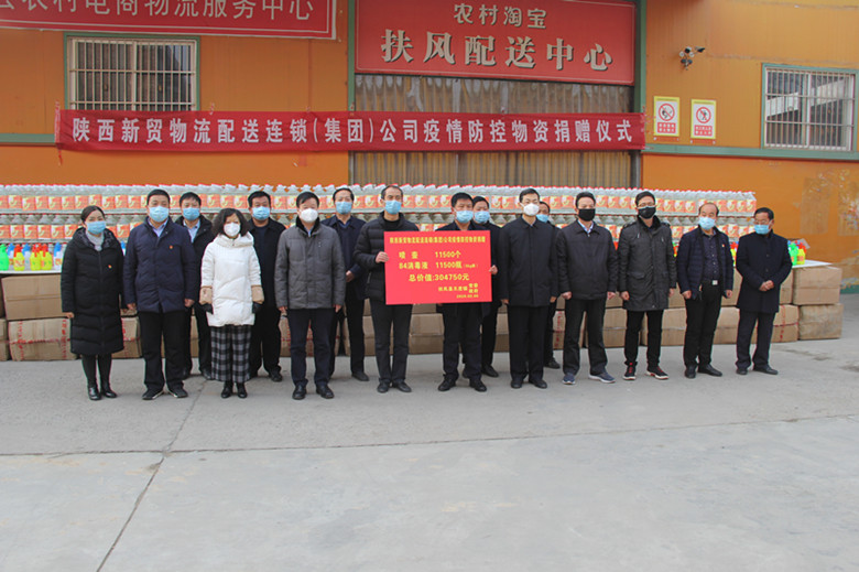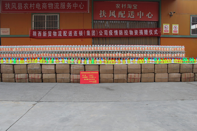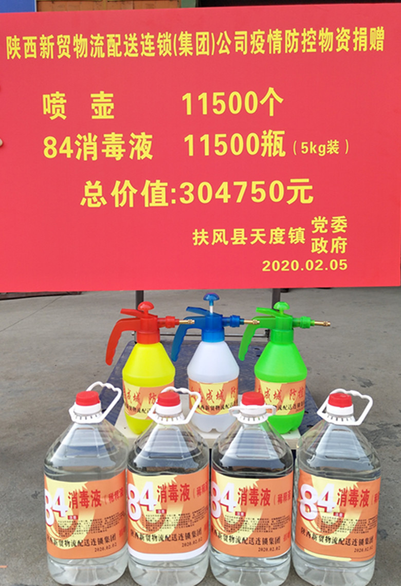 2月5日上午10时许,陕西新贸物流配送连锁集团再次伸出援助之手,向天度镇捐赠84消毒液11500桶(5kg)、喷壶11500个,价值304750元。