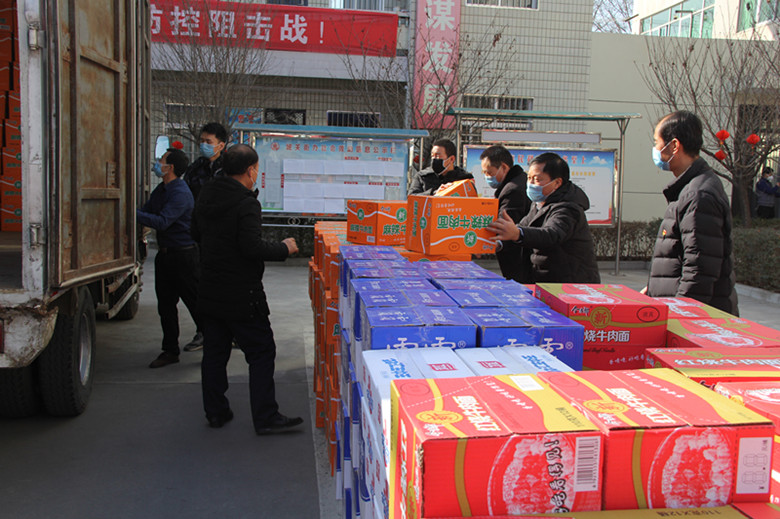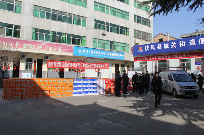 2月3日下午,陕西新贸集团党总支组织力量,为城关街道办事处各村组一线疫情防控人员捐赠伊利奶260箱、桶装方便面520箱、今麦郎水200件、火腿肠52箱、露露杏仁露50箱、84消毒液100斤、面包6件,总价值53656元的物资。