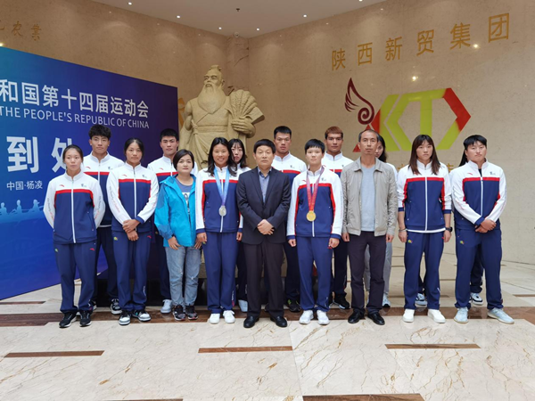 与贵州队员、十四届全运会皮划艇静水女子200米单人划艇冠军帅常文(右起第一位)、贵州队员、皮划艇静水女子500米双人划艇亚军卢小运(左起第一位)合影