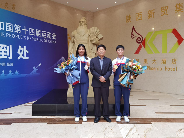 与河北队员、十四届全运会皮划艇静水女子200米单人划艇季军张璐琦合影